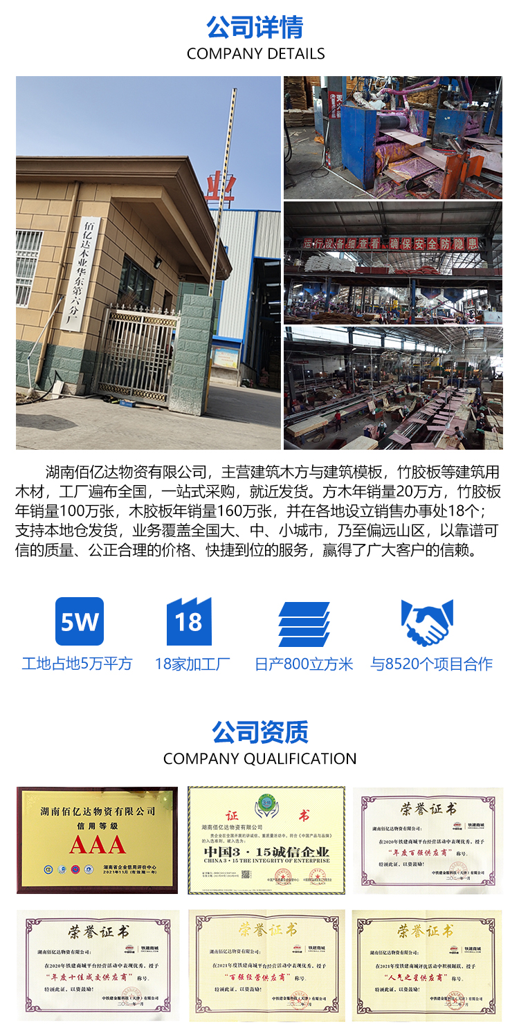 2、建筑模板表面涂層為防水性能強的酚醛樹脂膠,芯板采用三氨膠(單層過膠達(dá)0.45KG),采用層層過膠;